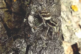 В кадр попал скакунчик опоясанный — Salticus cingulatus. Он очень похож на других своих собратьев, но отличается большей шелковистостью и оттенками раскраски.