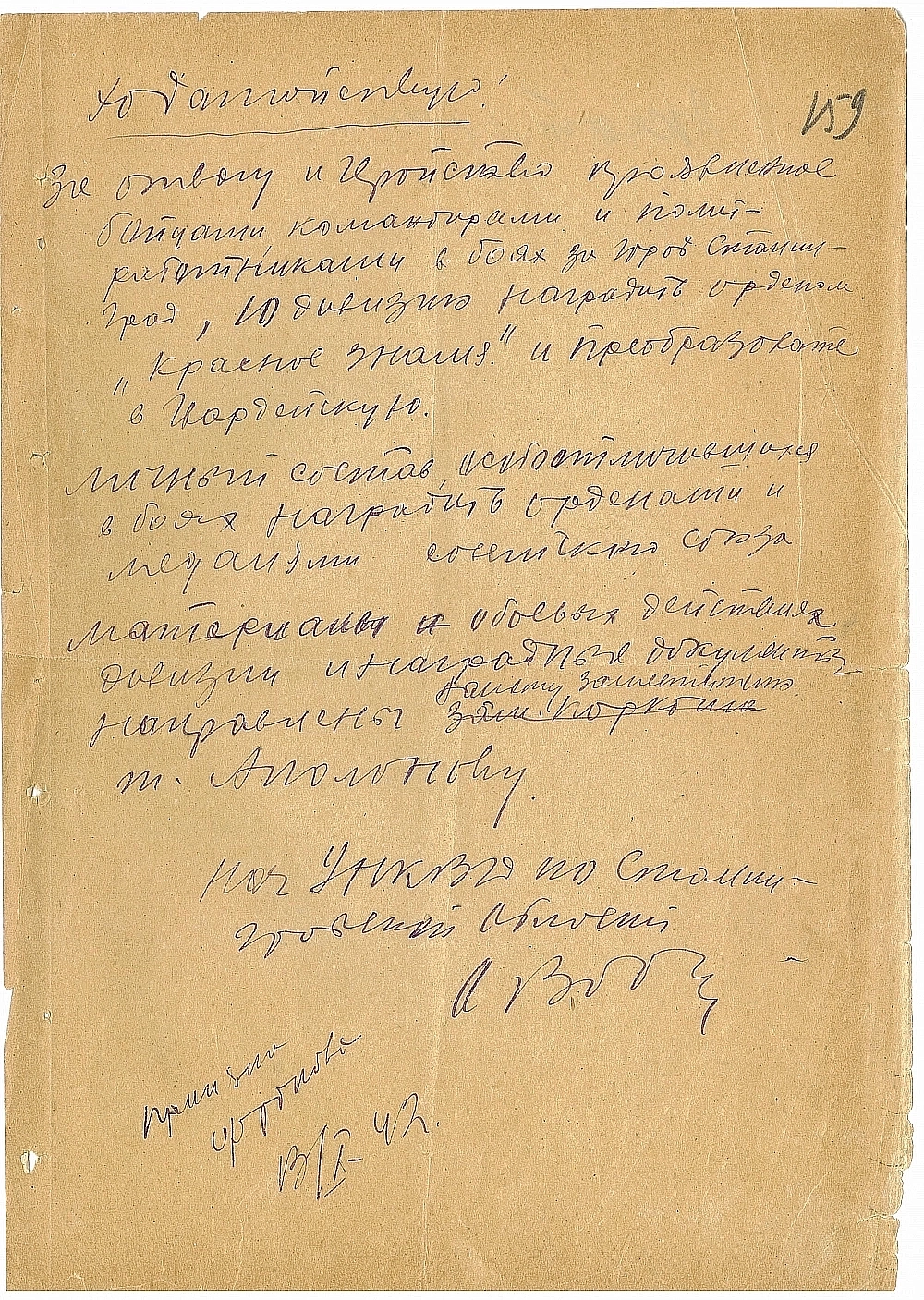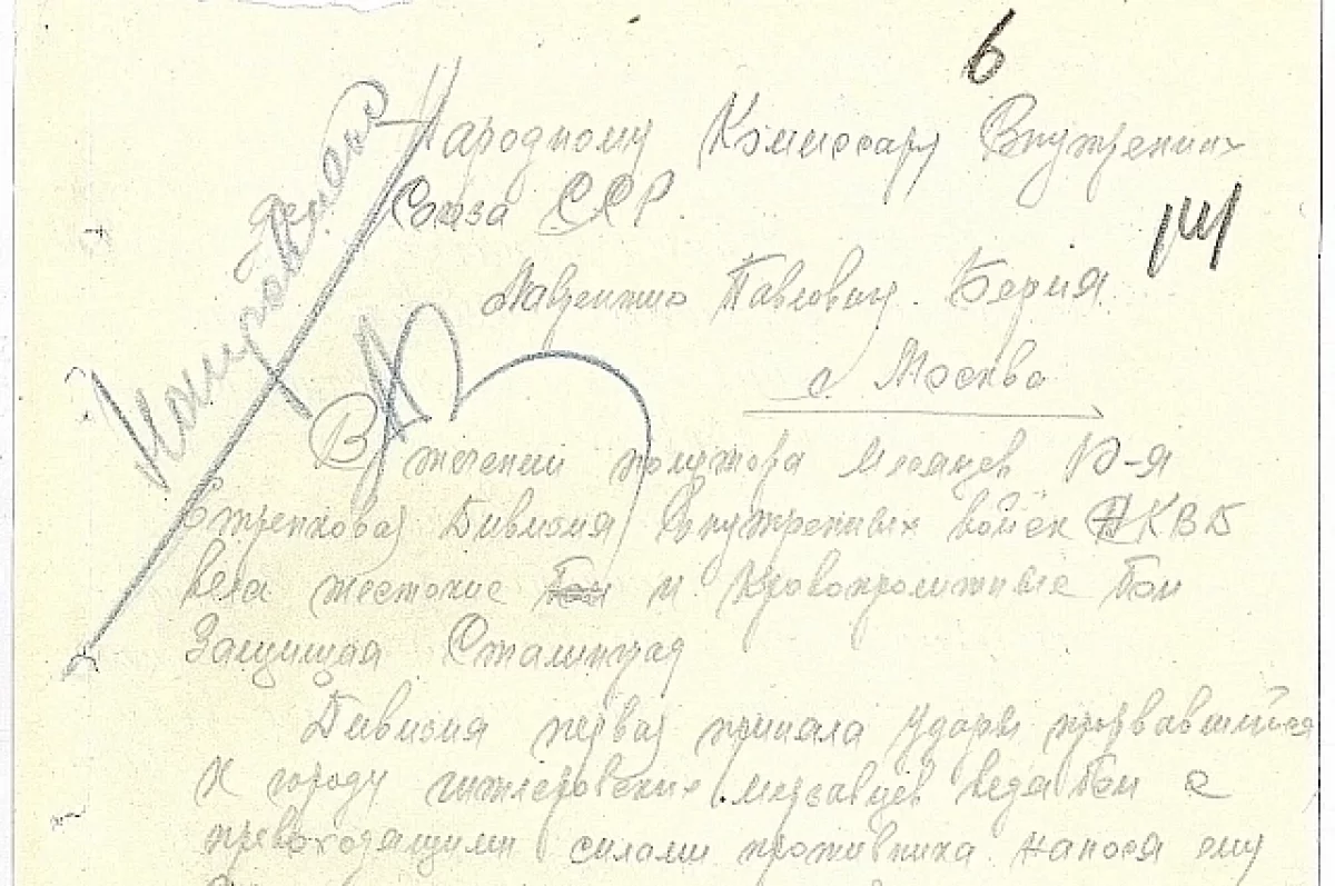 В числе материалов — письмо начальника Сталинградского управления ведомства Александра Воронина комиссару государственной безопасности Лаврентию Берии от 13 октября 1942 года. Глава регионального УНКВД ходатайствовал о награждении дивизии орденом Красного Знамени и преобразовании ее в Гвардейскую.