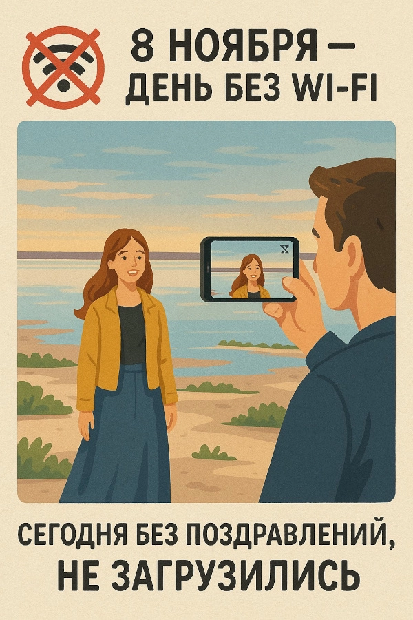 Тем более что Всемирный день без Wi-Fi выпадает в 2025 году на субботу, и погода словно создана для прогулок — синоптики обещают в регионе от +9º до +14º и временами сквозь облака будет проглядывать солнце. Так что приглашайте своих друзей и близких на улицу нашими открытками.