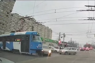 Утреннее ДТП с легковушкой и трамваем попало на видео в Волгограде