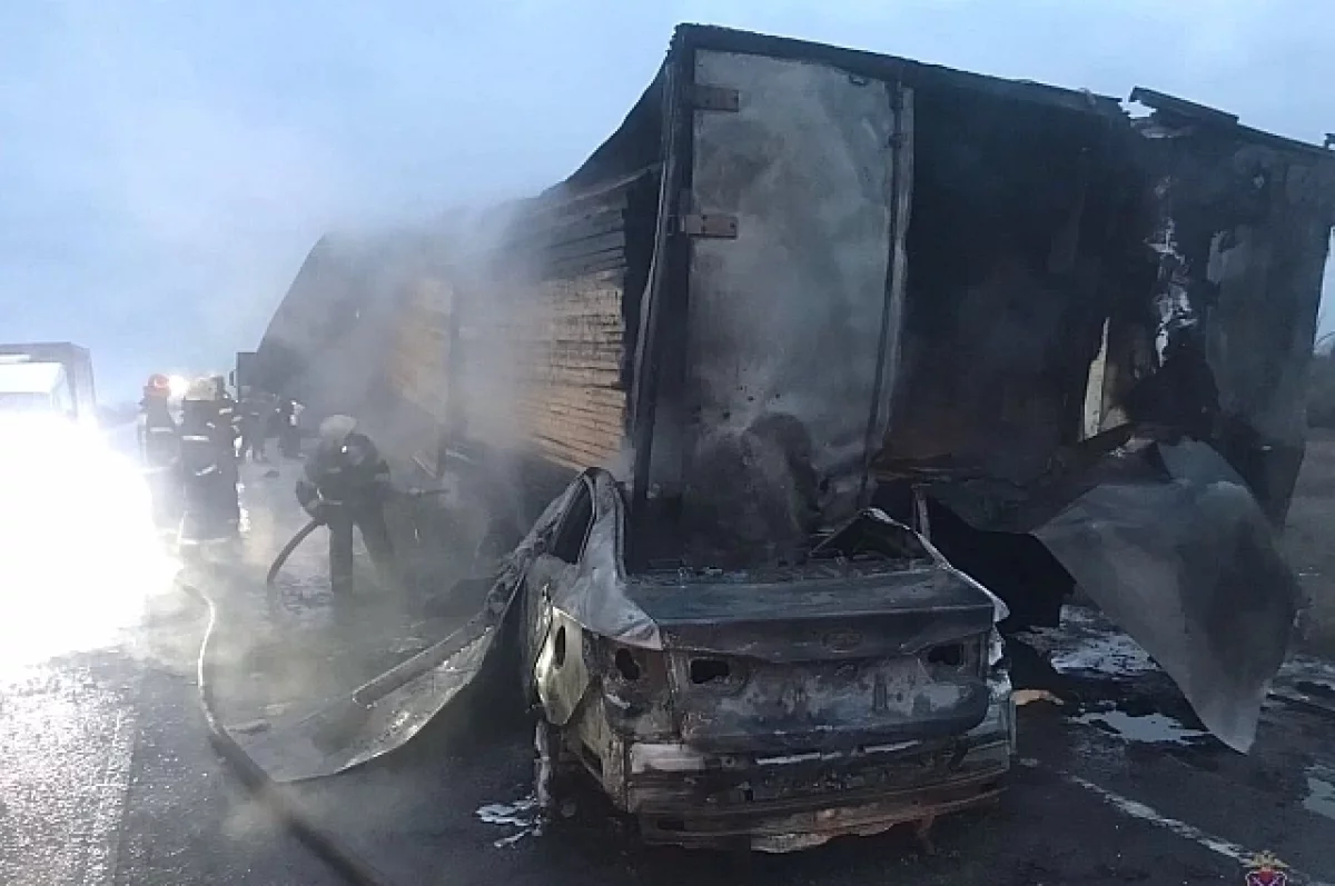 После столкновения автомобиль вспыхнул. Огонь перебросился на доски в полуприцепе Mercedes. На место пожара оперативно прибыли огнеборцы.