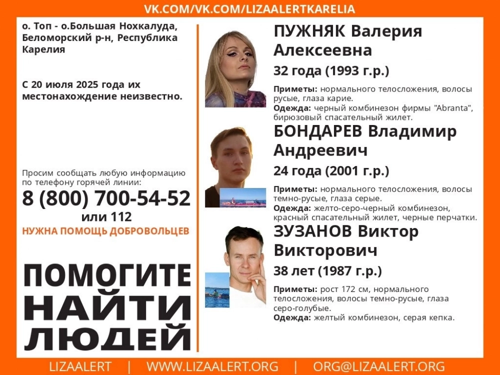 К поискам подключились волонтеры из карельского поисково-спасательного отряда «ЛизаАлерт». Они назвали имена тех, кто не справился со стихией. Ими оказались 38-летний Виктор Зузанов, 32-летняя Валерия Пужняк и 24-летний Владимир Бондарев.