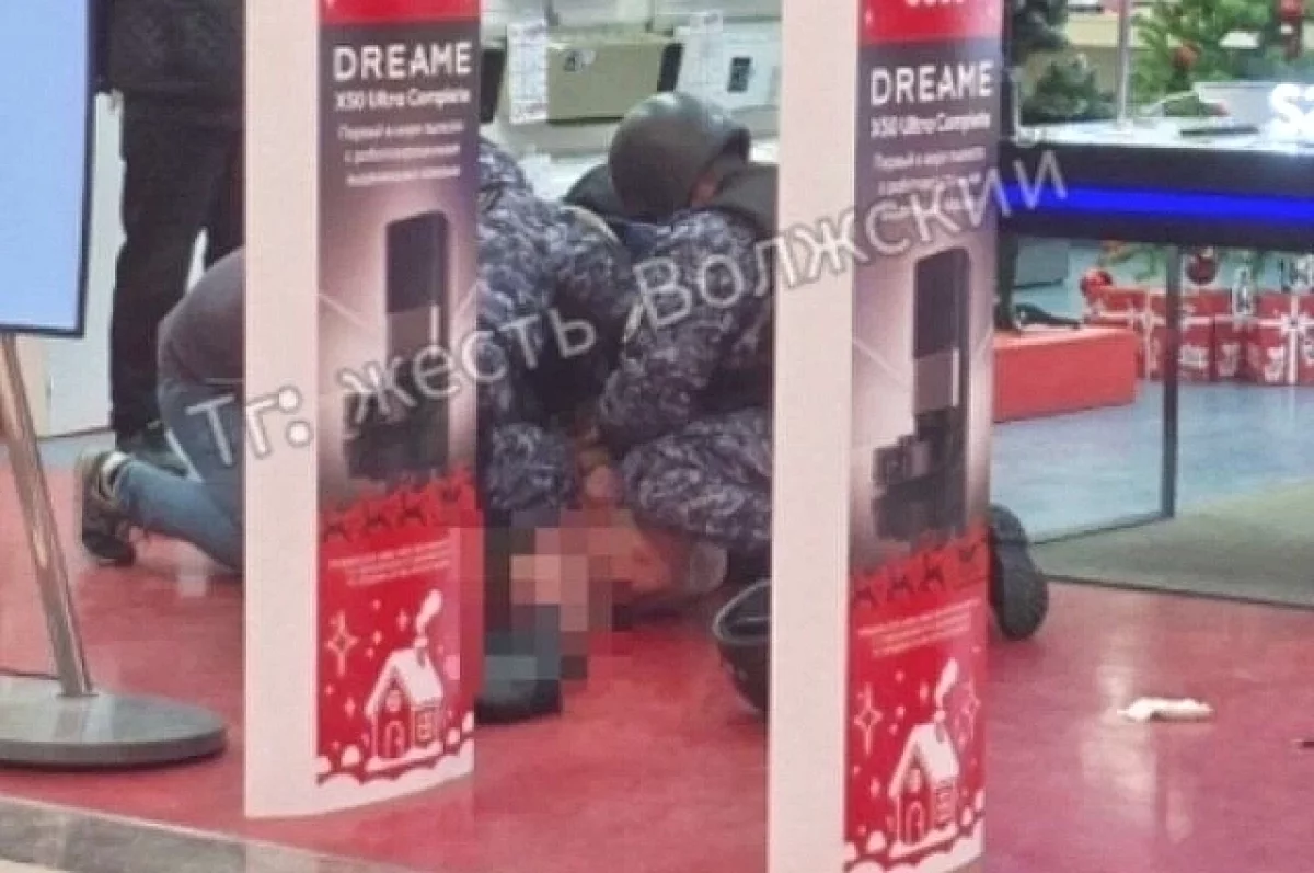 Обнаженный посетитель торгового центра устроил погром витрин. Судя по кадрам, которыми поделились волжане, мужчину уже задержали силовики.