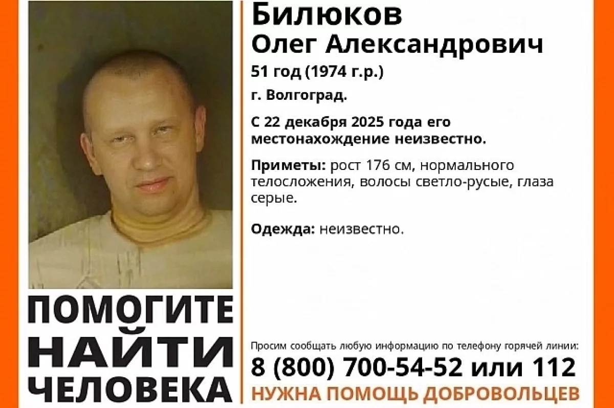 51-летний волгоградец нормального телосложения, у него светло-русые волосы и серые глаза. Рост – 176 сантиметров. Тех, кто располагает какими-либо сведениями об Олеге Билюкове, просят звонить по телефонам 8-800-700-54-52 или 112.