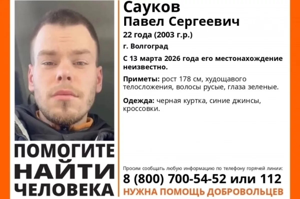 22-летний Павел Сауков бесследно исчез еще 13 марта. С тех пор родственные и близкие юноши не могут с ним связаться. Последний раз зеленоглазого, худощавого молодого человека ростом около 178 см и с русыми волосами видели в синих джинсах, черной куртке и кроссовках.