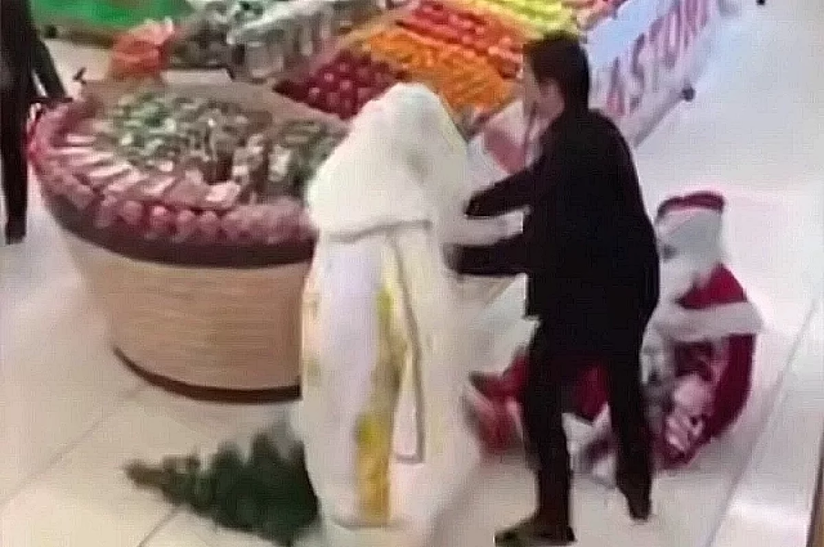 Два Деда Мороза — один в белых, другой в красных одеждах — устроили боксерский ринг из торгового зала одного из бакинских магазинов.