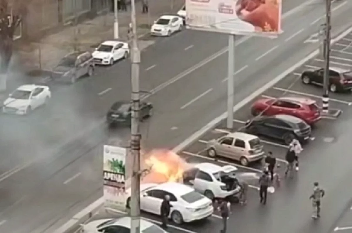 Автомобиль внезапно вспыхнул на парковке торгово-развлекательного центра в Волгограде.