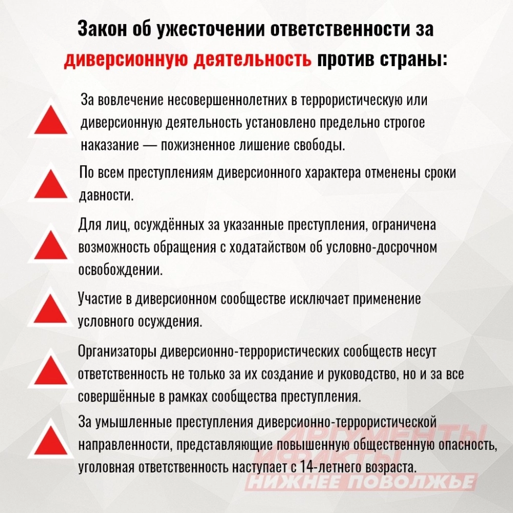 В то же время возрастная планка ответственности за преступления диверсионно-террористической направленности понижена до 14 лет, если они совершены умышленно и несут опасность для общества, а подросток эту опасность осознает.