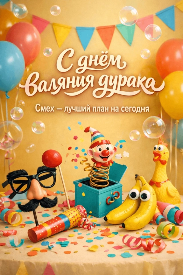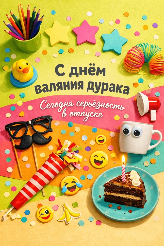 В этот день принято дурачиться, разыгрывать друзей, рассказывать анекдоты и делать всё, что поднимает настроение и вызывает улыбку. Считается, что такие дни помогают снять стресс, зарядиться позитивом и взглянуть на жизнь с юмором. Чтобы напомнить близким о важности беззаботного отдыха и поздравить их с этим лёгким праздником, выберите забавную открытку из нашей коллекции.