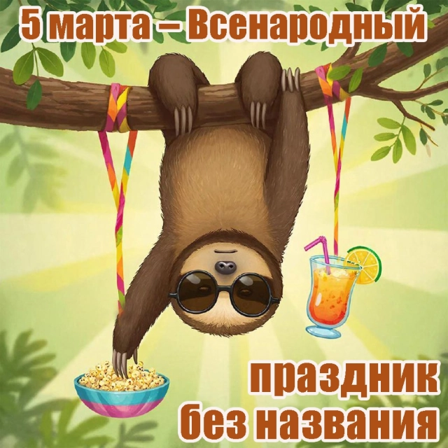 А ещё 5 марта в неофициальном календаре значится Всенародный праздник без названия — пожалуй, один из самых оригинальных праздников в году. У него нет цели, нет причины и нет даже названия. Считается, что его придумали лентяи, настолько ленивые, что и название придумывать не стали. И время выбрали подходящее — начало весны, когда после зимы силы ещё не восстановились, накрывает авитаминоз и так хочется просто ничего не делать. Единственное условие праздника: «Делайте что хотите, главное ничего не делайте».