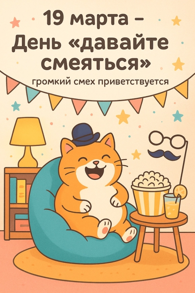 19 марта в США и других странах мира отмечается День «Давайте смеяться» — праздник, созданный неизвестным юмористом, который просто хотел поднять настроение окружающим и напомнить о важности чувства юмора в любых жизненных обстоятельствах. В национальном календаре США он появился в 1971 году как способ привлечь внимание к проблемам, связанным со стрессом и депрессией.