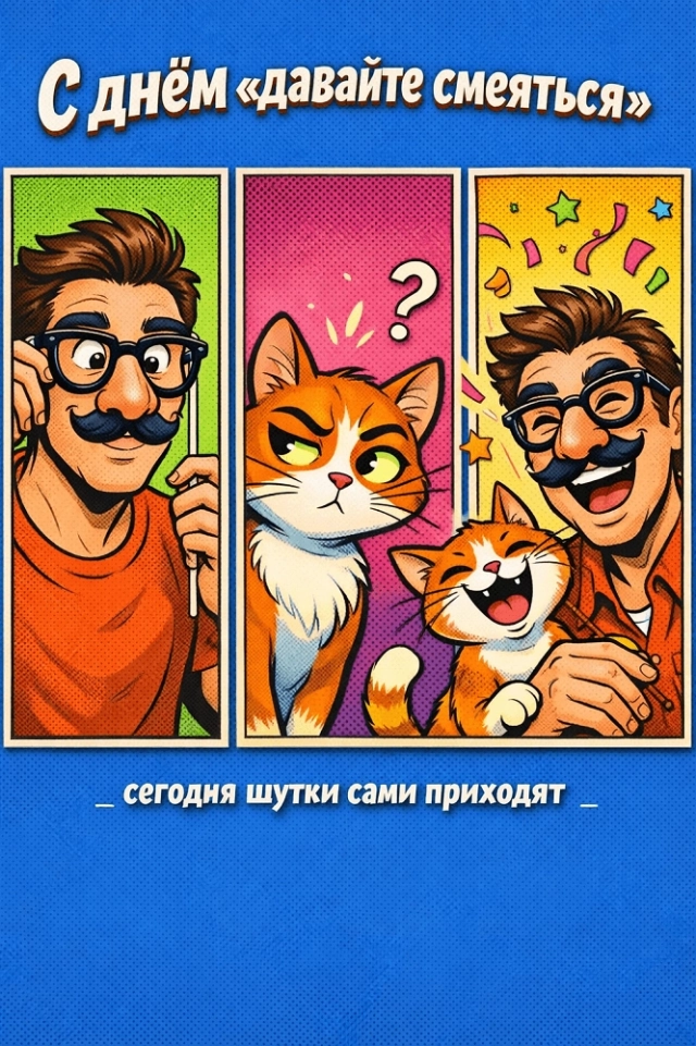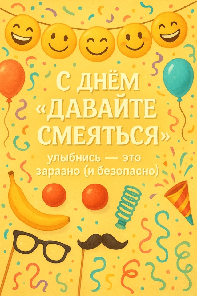 В этот день принято пересматривать любимые комедии, устраивать шутливые розыгрыши, делиться забавными постами в соцсетях и, конечно, щедро дарить улыбки близким и даже незнакомцам. Чтобы подарить друзьям заряд позитива и поздравить их с этим весёлым днём, выберите открытку из нашей коллекции.