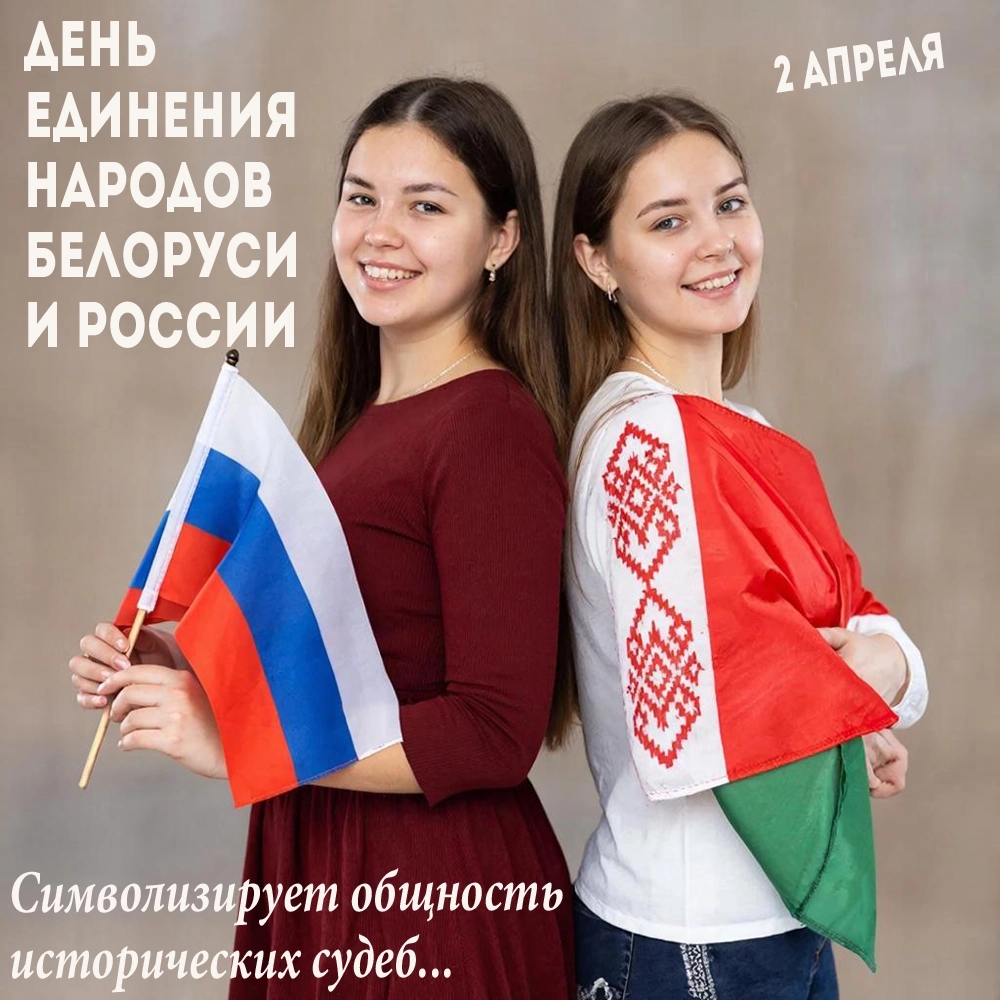 2 апреля отмечается День единения народов Беларуси и России — государственный праздник, установленный в память о подписании Договора об образовании Сообщества Беларуси и России 2 апреля 1996 года. В 1997 году Сообщество преобразовали в Союз Беларуси и России, а в 1999 году подписали Договор о создании Союзного государства. Праздник символизирует общую историю, духовное родство и многолетние интеграционные процессы между двумя странами.