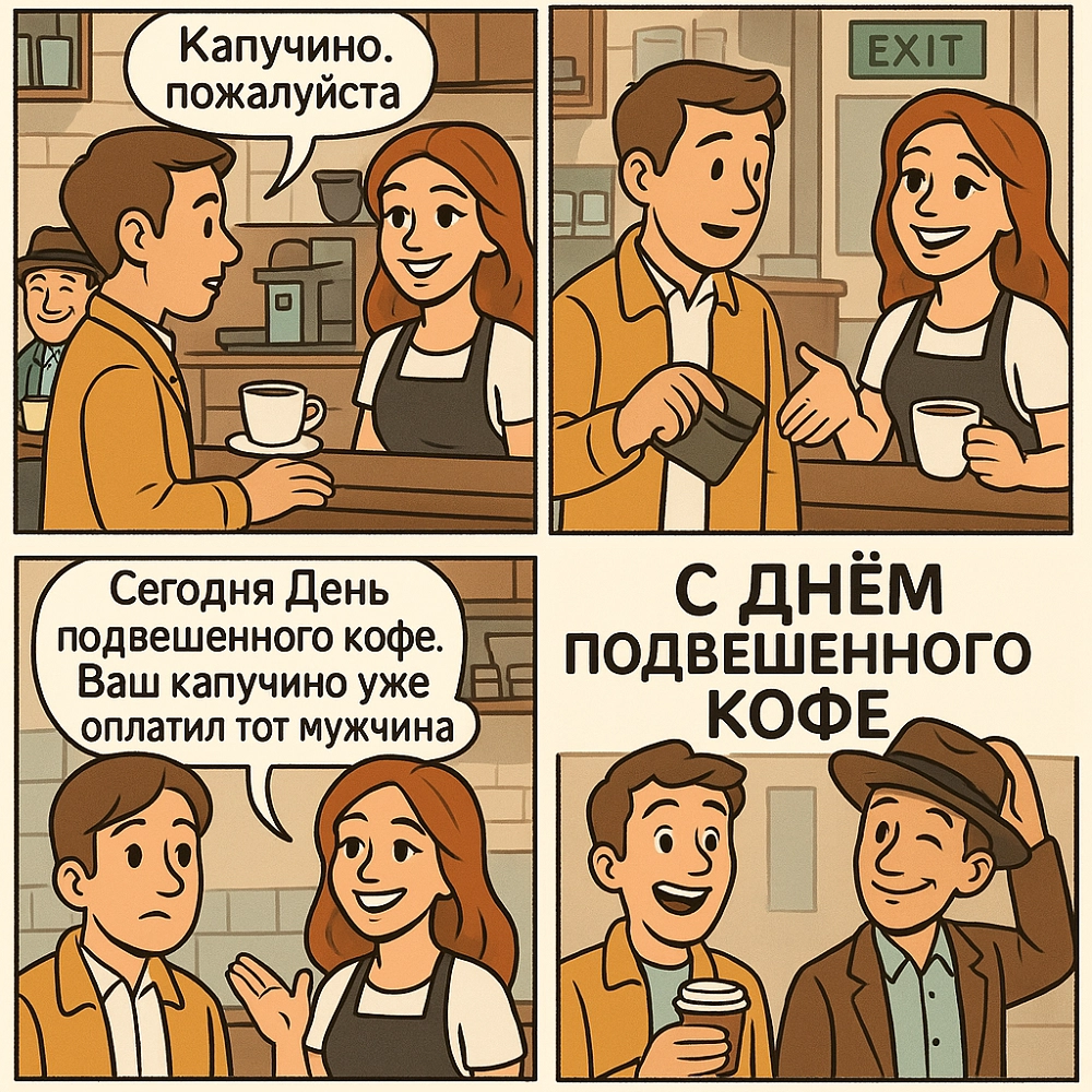 Сегодня тот самый день, когда можно практически без усилий сделать жизнь одного человека счастливее, просто оплатив два кофе, вместо одного. А если вы хотите, чтобы счастья стало больше в разы, отправьте своим знакомым одну из наших открыток и напомните им об этой традиции.