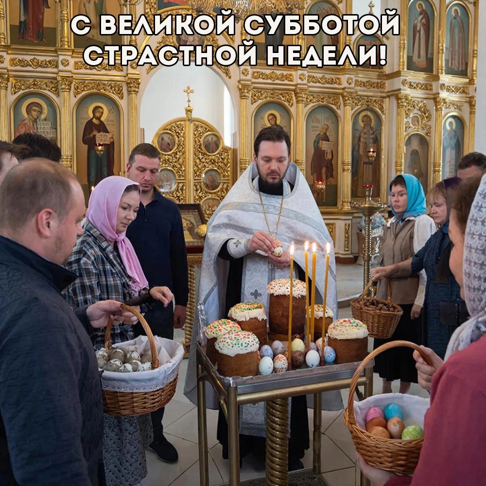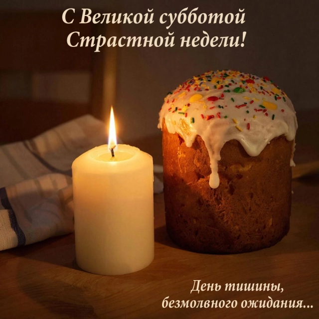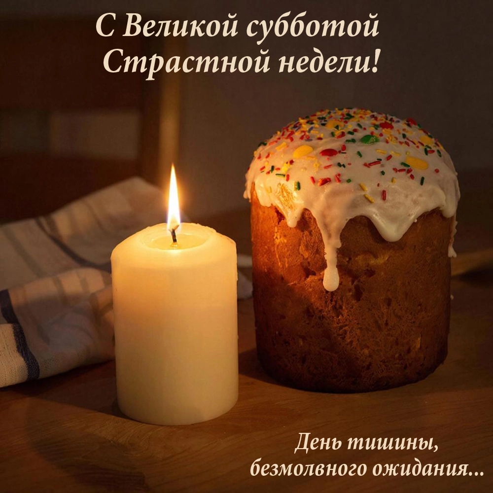 По народной традиции, именно в субботу хозяйки заканчивали подготовку пасхального стола и красили яйца в красный цвет. Чтобы поздравить верующих с наступающей Пасхой и пожелать им светлой радости, выберите душевную открытку из нашей коллекции.