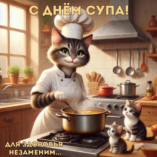 В этот день принято готовить и пробовать самые разные супы — от традиционных щей и борща до экзотических тыквенных крем-супов и гаспачо. Чтобы пожелать близким приятного аппетита и поздравить их с этим вкусным праздником, выберите аппетитную открытку из нашей коллекции.