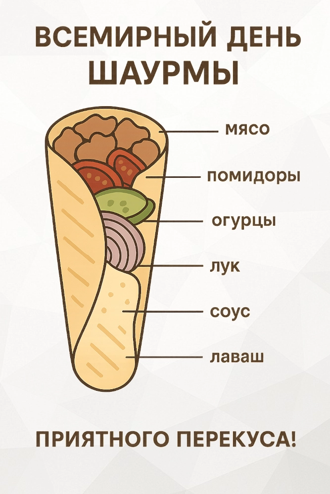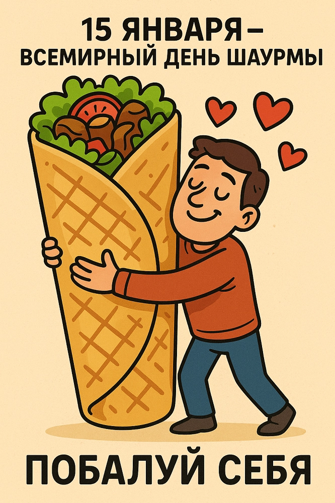 15 января отмечается Всемирный день шаурмы. Это один из тех неофициальных праздников, что напоминают нам: иногда самое простое и доступное блюдо может стать символом глобализации и соединить разные культуры. Он посвящён всемирно известной «еде на бегу», в которой сочетаются аромат жареного мяса, свежесть овощей и вкус любимого соуса, завёрнутые в тёплую лепёшку.