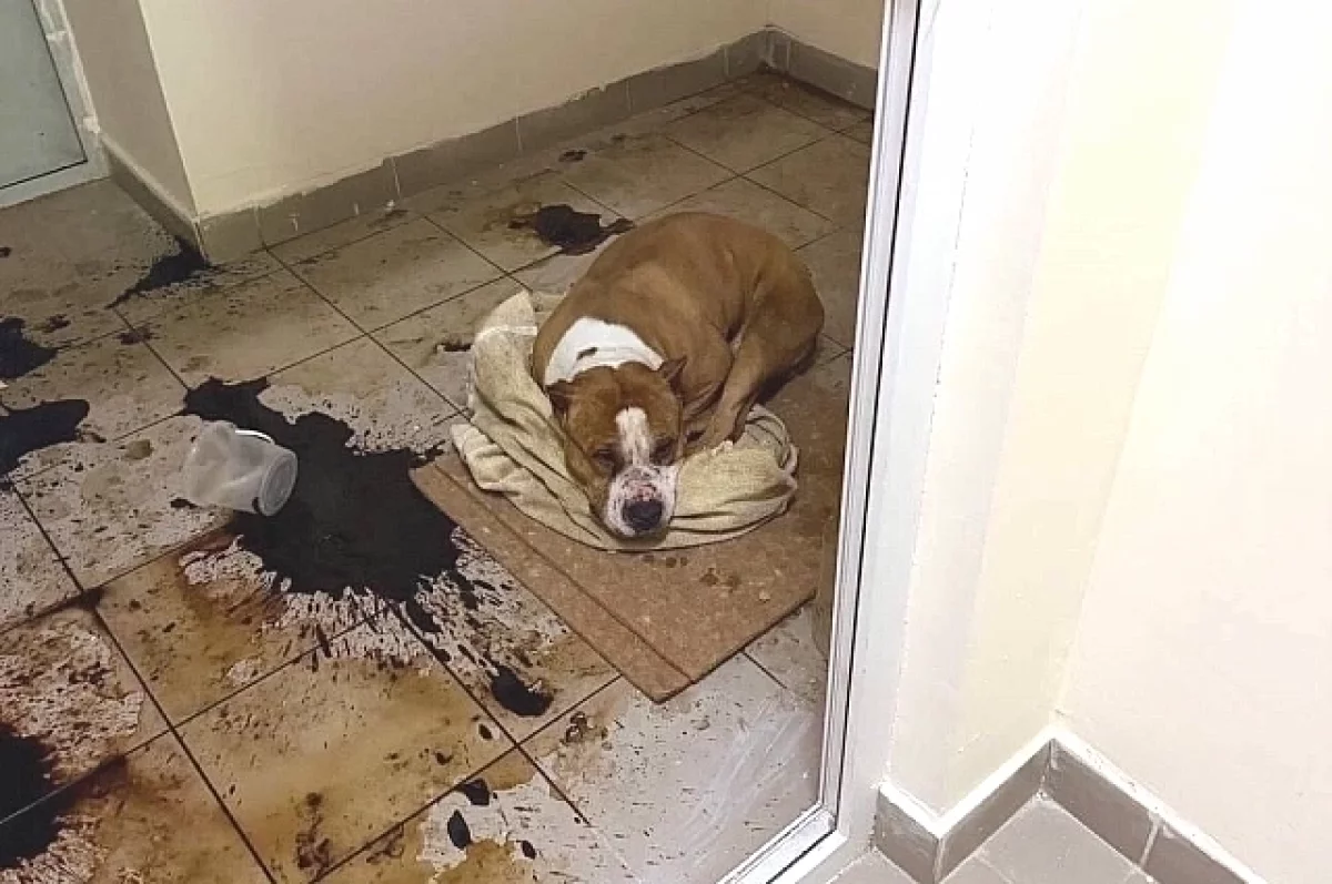 Собака лежала на полу, не имея сил подняться. Вокруг были следы выделений темного цвета. По словам зоозащитников, это явный признак тяжелой интоксикации.