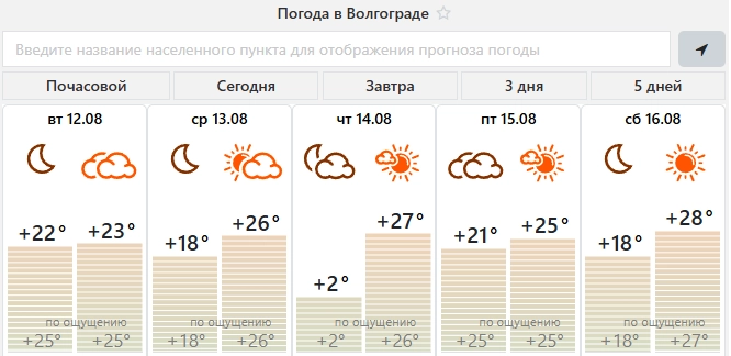 Жара будет потихоньку уходить и в дневные часы. По данным волгоградских синоптиков, которые все же ближе к месту, во вторник днем столбик термометра поднимется в среднем по региону до +20-25º, в среду – до +23-28º, а в четверг – до +21-26º.