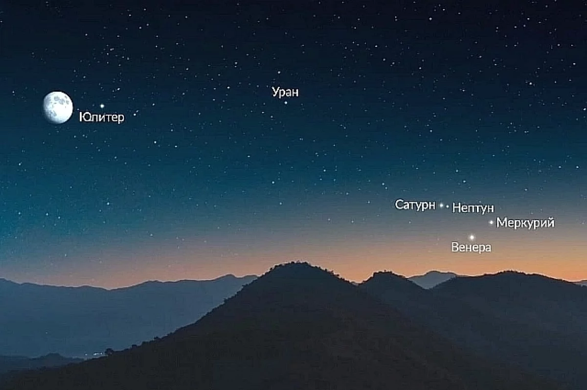 Шесть планет выстроятся в ряд в небе в конце февраля. К Меркурию, Венере, Нептуну, Сатурну, Урану и Юпитеру присоединится расположенная неподалеку от него спутник земли Луна, сообщает starwalk.space.