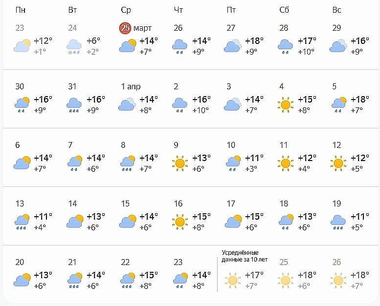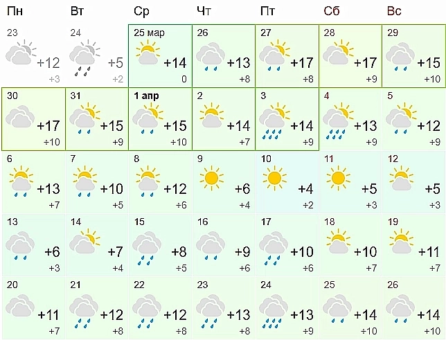 Более оптимистичен прогноз сервиса Яндекс.Погода — здесь к последней мартовской пятнице обещают жителям региональной столицы от +9º ночью до +18º днем. А с 1 апреля не ниже +7...+14º.