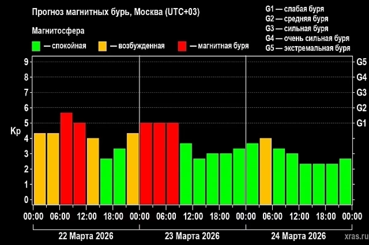 Самая мощная с начала 2026 года магнитная буря бушует уже несколько дней. Специалисты прогнозировали, что ее пик придется на 19-21 марта, а на 22-24 числа месяца придется только более слабый «хвост». Однако к шести утра воскресенья сила геомагнитного возбуждения достигла шести баллов. И только после 9:00 она снизится до пяти баллов, а после полудня — до четырех.