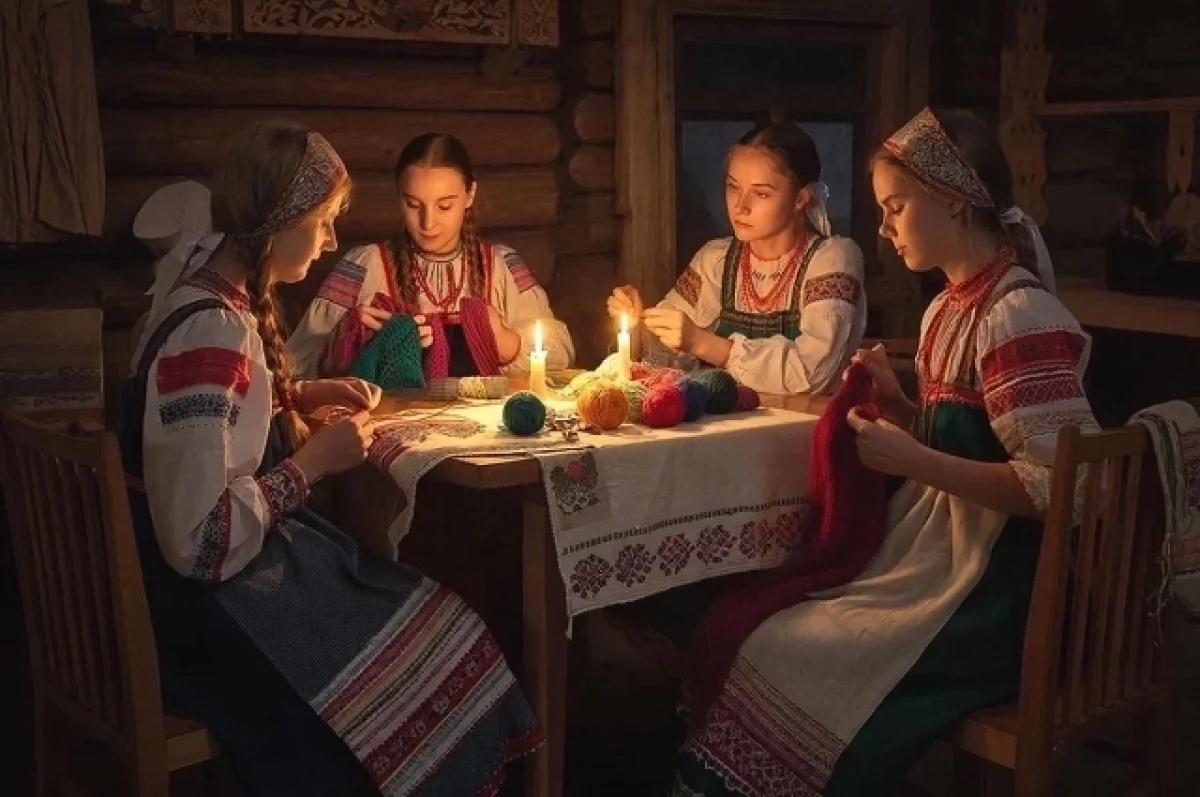 Вечером же, после выполнения всех семейных обрядов, молодежь могла снова собираться на посиделки («вечорки»). Но теперь эти посиделки часто проходили в больших избах, где собирались целыми семьями — и стар и млад. Пели протяжные, лирические песни, а не только озорные колядки, рассказывали былички (истории о встрече с нечистой силой), готовились к главным святочным гаданиям, которые приходились на Васильев вечер (13 января).