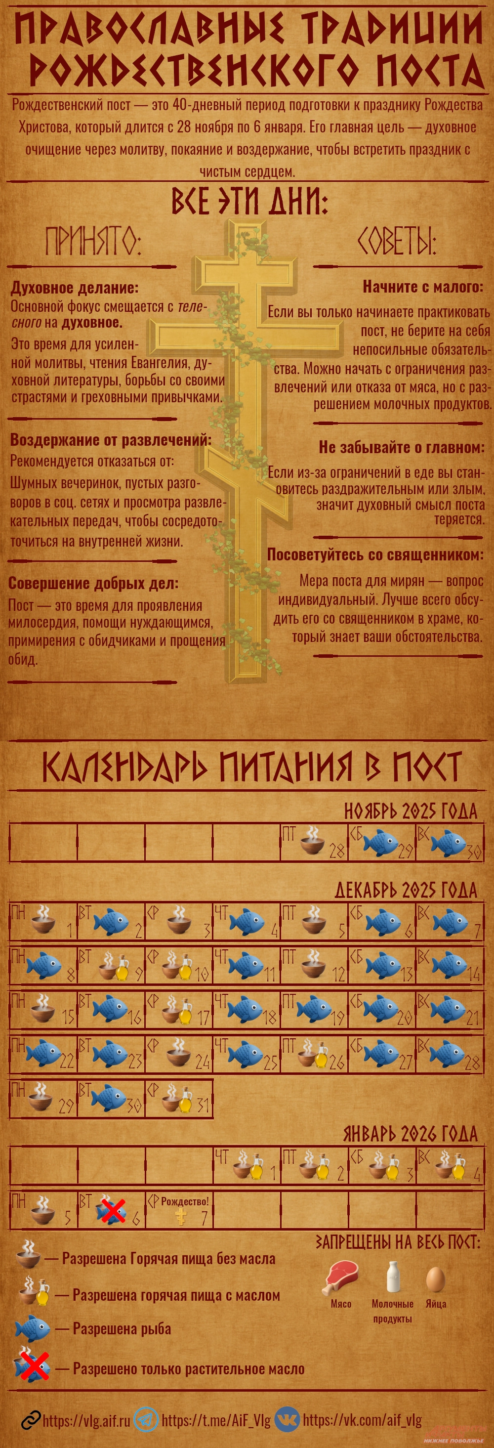 Рождественский пост начинается у православных христиан 28 ноября. Он продлится по 6 января 2026 года. Все это время православные христиане будут готовиться к Рождеству Христову.