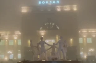 В кадры попал железнодорожный вокзал и окутанные туманом детские фигурки фонтана на Привокзальной площади.